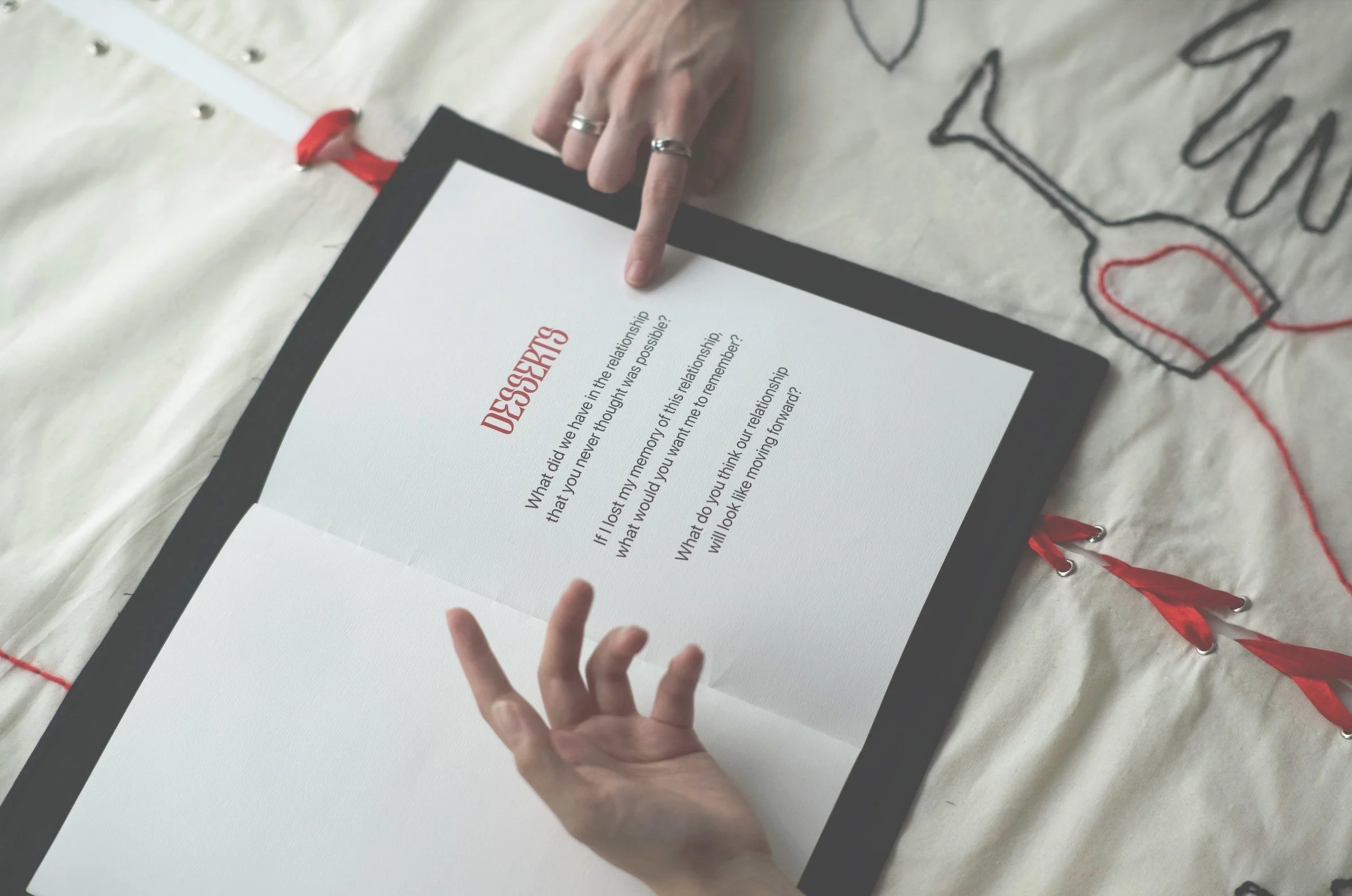 ❀ A breakup kit that follows the experiences of a dinner, complete with a menu, utensils, and other items that forms a new experience of a break-up, easing pain points that break-up texting often lacks.